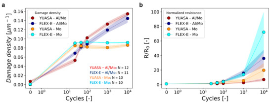 If the 20% increase is considered as the electrical failure criteria [12,31,32,34], then after only 25 cycles about half the YUASA samples (Figure 9) would be considered failed, while for the other half of the samples, the 20% increase occurs between 100 and 1000 cycles. The difference to the single Mo film system is that the crack or damage density is not at a saturation point after 25 cycles, nor at a saturation after 10,000 bending cycles in the Al/Mo bilayers. In a more ductile film system, TTCs take longer to form and can also be slower to extend across the sample width due to crack growth mechanisms. TTCs still form even though the applied bending strain was lower than the measured COS of the film system. While for the Mo system (COS = 1.0%), fracture is expected at the first bending cycle (bending strain = 2.5%), for the Al/Mo system (COS = 4.3%), damage takes more time to accumulate and saturate. A more thorough examination of the in situ resistance data is performed in the discussion.