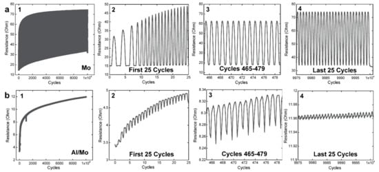 A closer examination of representative in situ resistance data for the (a) Mo system and the (b) Al/Mo system. For both film systems, the full resistance data (1), the initial 25 cycles (2), the cycles ranging between 465 and 479 (3), and the last 25 cycles (4) are shown. Key features are the amplitudes of the resistance curves, the increasing average resistance, and the shape of the sine curves. Note the different y-axes for all parts.
