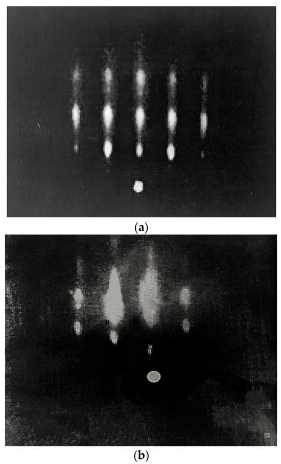 Figure 4 shows HSED images of the surface of a pure GaP and GaP sample with a Ga0.6In0.4P film with a thickness of 3–3.5 nm. The images clearly reveal reflections characteristic of cubic lattices. However, in the case of a three-component film, the reflections are bolder and blurrier. This is apparently due to some discrepancy between the lattice parameters of GaP and GaInP (see Table 1).