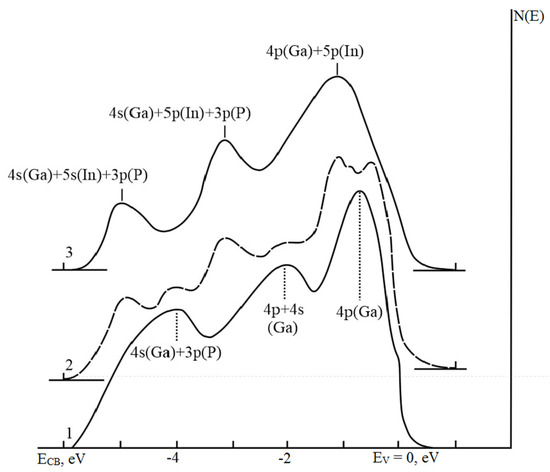 Figure 5 shows the photoelectron spectra obtained after heating at T = 950 K (heating time 40 min) of GaP implanted with In+ ions with E0 = 1 keV at doses of 1015 (curve 2) and 6 × 1016 cm−2 (curve 3) [29,32]. In the first case, nanocrystalline phases with surface diameters d = 15–20 nm were formed, and in the second case, a Ga0.6In0.4P film was formed. These spectra well reflect the distribution of the density of the state of the valence band electrons. It can be seen that the spectrum of pure GaP exhibits maxima at binding energies of Ecb ≈–0.8 eV; –2.2 eV; and 4 eV, probably due to the excitation of electrons from the 4p and 4p + 4s states of Ga, as well as the hybridization of the 4s states of Ga with the 3s states of P (Figure 5, curve 1) [29,32]. In the case of the Ga0.6In0.4P film, the spectrum (Figure 5, curve 3) contains intense peaks with Ecb = −1.2; −3.3; and −5.6 eV, apparently associated with the excitation of electrons from the hybridized states of electrons 4s(Ga) + 5p(In), 4s(Ga) + 5p(In) + 3d(P), and 4s (Ga) + 5s(In) + 3d(P). The spectrum of GaP with Ga0.6In0.4P nanocrystals reveals some features characteristic of both GaP and Ga0.6In0.4P (Figure 5, curve 2).