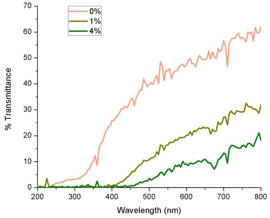 The transmittance percentage indicates how transparent or opaque a material is [40]. Figure 2 shows the percentage of transmittance of the films against the wavelength, where it is observed that increasing the content of asparagus extract in the film decreases the percentage of transmittance. Based on this percentage of transmittance, materials are classified as transparent if their transmittance is greater than 80%; they are translucent if they are between 10 and 80%; and if they are less than 10%, they are considered opaque [41]. According to this classification, the three formulations of films developed were classified as translucent materials. Some materials, such as polyethylene terephthalate, have a transmittance percentage >90%; for cellulosic materials, the transmittance value is around 85%, while for amber glass, it is 40% [42]. The addition of natural-derived additives in the films tends to absorb ultraviolet light and act as a barrier to these areas of the electromagnetic spectrum, due to UV-absorbing aromatic structures and functional groups such as phenolic units, catechol groups, unsaturated bonds, ketones, and other chromophores [43]. Knowing which areas our material absorbs allows us to direct the use of the developed materials to those applications in which they could provide better protective activity.