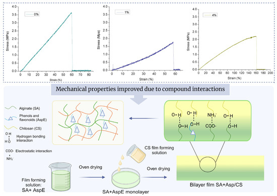 Stress–strain graph of films of the control bilayer film (F0%) and bilayer films with the addition of 1% (F1%) and 4% (F4%) of asparagus extract residues and the scheme of the interaction mechanism of asparagus extract with chitosan (CS) and alginate (SA) and their influence on the mechanical properties. The figure was created using BioRender.com.