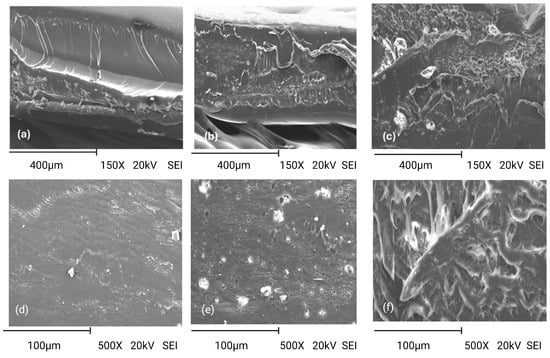 Cross-section micrography of the control bilayer film and bilayer films with the addition of asparagus extract residues: F0% film (a,d); F1% film (b,e); F4% film (c,f). Magnification was 150× for (a–c), and was 500× for (d–f).