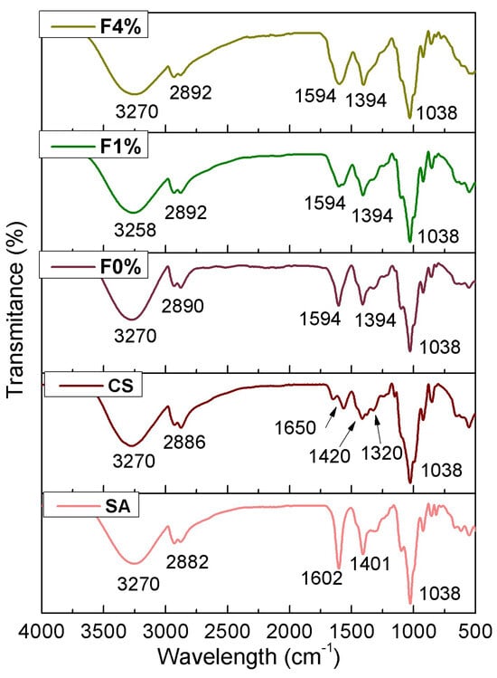 The possible interactions between the extracts and SA-CS were evaluated by FTIR, using a PerkinElmer Spectrum 2000 spectrophotometer (PerkinElmer Co., Norwalk, CT, USA). The samples were scanned 16 times in the spectral range of 4000 to 400 cm−1, with a resolution of 4 cm−1.
