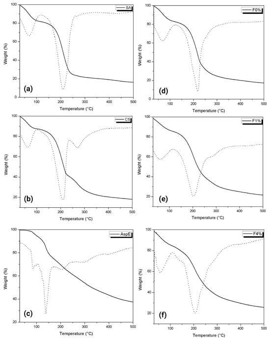 The films were prepared according to the method described by Concha-Meyer et al. [22], with some modifications. Solutions of 1% sodium alginate (SA) in MiliQ water and 1% chitosan (CS) in 0.1 M acetic acid were prepared by magnetic stirring at 70 °C for 40 min for SA and at 40 °C for CS. Freeze-dried AspE (1 and 4 wt%) was added to the SA solutions. For better incorporation, the freeze-dried AspE was dissolved in 5 mL of water before incorporation into SA solutions. After 15 min of magnetic stirring to improve homogeneity, 1 mL of glycerol was added to each solution (SA and CS). The films were prepared by casting (pouring on a plate). Briefly, 10 mL of the SA + AspE film-forming solution was taken and added to a Petri dish (diameter of 35 mm). It was placed in a convection oven at 35 °C for 4 h to dry until a solid but sticky surface was obtained to promote the interaction between the polymers. Subsequently, 10 mL of the CS film-forming solution was added. They were then placed in the oven for another 8 h. Once dry, the films were stored in the dark and placed in a desiccator at 50% relative humidity prior to analysis. These films were coded as F1% and F4%. Under the same conditions, a bilayer film was prepared with no addition of AspE, which was used as a control (F0%). Monolayer films of SA and CS were prepared for analysis by FTIR and TGA to study their contribution to the obtained results. Additionally, the thermal stability of AspE was evaluated.