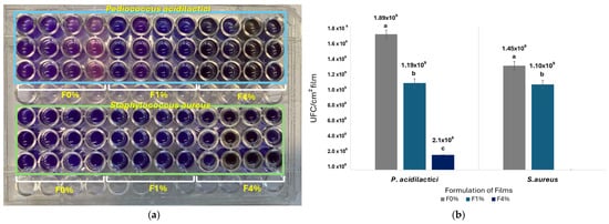 The cell growth of bacteria treated with the films incorporated with different concentrations of asparagus residue extracts was evaluated. The quantitative colorimetric method used to determine the cell proliferation capacity was resazurin (Alamar Blue (7-hydroxy-10-oxydophenoxazin-10-io-3-one) (non-fluorescent blue). In this method, resazurin was reduced to resorufin (pink, highly fluorescent) by oxidoreductases found mainly in the mitochondria of viable cells, allowing for differentiation between viable (pink) and non-viable (purple) cells. For this purpose, 1 cm2 pieces of film were cut and placed in a 12-well plate, and 50 μL inoculum of the standardized microorganism (1–3 × 108 bacteria/mL) was added to each well. The plate was incubated for 24 h at 37 °C. At the end of the incubation period, the foil pieces were carefully removed and placed in 1 mL of saline solution, which was gently shaken back and forth 25 times. Then, 250 μL of this solution was taken and added to a 96-well plate containing 20 μL of resazurin and incubated for 4 h in an incubator (Thermo Scientific™ Heratherm™, Waltham, MA, USA), after which the absorbance was read in a microplate reader at a wavelength of 570 nm [30]. The cell’s bacterial growth was reported as CFU/cm2 film.