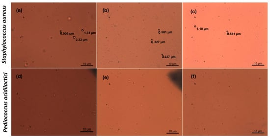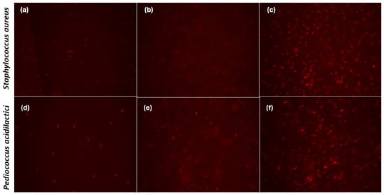 Images from fluorescence microscopy (100×) of S. aureus (a–c) and P. acidilactici (d–f) treated with the control bilayer film and bilayer films with the addition of asparagus extract residues: (a,d) bacteria cells treated with F0% film; (b,e) bacteria cells treated with F1% film; (c,f) bacteria cells treated with F4% film.