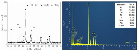 The NiCoCrAlY-Cr2O3-AgMo-coated samples were cut into standard specimens with dimensions of 10 mm × 10 mm × 5 mm utilizing a wire cutting machine. The phase composition of the NiCoCrAlY-Cr2O3-AgMo coating was analyzed by XRD utilizing an XRD-6000 X-ray diffractometer with Cu Kα radiation. The XRD analysis was performed at an operating voltage of 40 kV, an operating current of 30 mA, a scanning range of 20°–120°, and a scanning speed of 4°/min. The microhardness of the NiCoCrAlY-Cr2O3-AgMo coating was measured utilizing an HVS-1000A micro-Vickers hardness tester with an applied load of 200 g and a dwell time of 10 s.