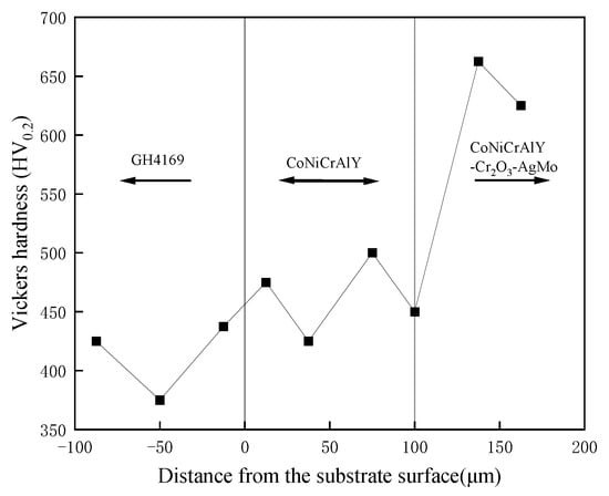 Cross-sectional hardness distribution of the NiCoCrAlY-Cr2O3-AgMo coating.