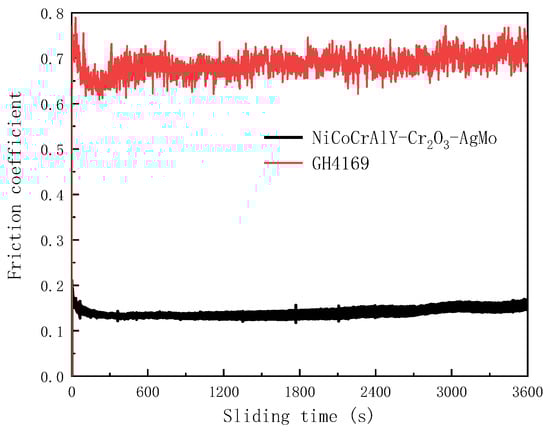 COF of GH4169 and NiCoCrAlY-Cr2O3-AgMo (normal load of 8 N, 2000 rpm, room temperature).