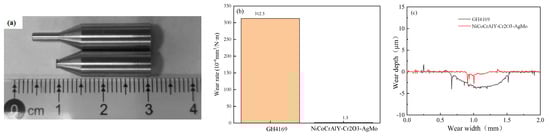 Wear results for GH4169, NiCoCrAlY-Cr2O3-AgMo coating, and GH605 cylindrical pins: (a) wear image of the pins, (b) wear rate of the pins, (c) Wear profiles of GH4169, NiCoCrAlY-Cr2O3-AgMo. (Normal load of 8 N, 2000 rpm, room temperature).
