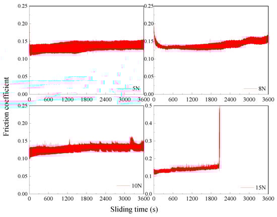 Figure 6 illustrates the COF values of NiCoCrAlY-Cr2O3-AgMo coatings under various loads: 5 N, 8 N, 10 N, and 15 N. At a 5 N load, the initial COF sees a sharp increase to 0.125, after which it maintains a stable state with almost no fluctuation. Under a normal load of 8 N, the initial COF rises rapidly to 0.175. After 100 s, it gradually decreases to 0.135 and remains stable. However, after 2100 s, an upward trend appears with minor fluctuations. The average COF throughout the entire process is 0.139. With a 10 N load, the initial COF climbs swiftly to 0.125 and then stabilizes with minimal fluctuation. Finally, under a 15 N load, the initial COF also increases rapidly to 0.125, followed by a slow upward trend. However, after 2100 s, there is a dramatic increase in the COF, indicating coating failure. A comparative analysis indicates that the AgMo coating exhibits a relatively low and stable COF under a 10 N load, suggesting that at this specific load, AgMo can promote the formation of a lubricating film, thereby reducing friction [23]. Increasing the load to 15 N, however, results in the destruction of the coating’s microstructure due to the significantly larger contact stress. In severe cases, this can lead to complete coating failure and a consequential increase in the COF.