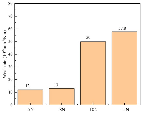Figure 7 illustrates the wear rates of GH605 cylindrical pins under various loads. At a load of 5 N, the wear rate of GH605 is merely 1.2 × 10−6 mm3/N·m. When the load increases to 8 N, the wear rate rises to 1.3 × 10−6 mm3/N·m, representing an 8.3% increase compared to the 5 N load. At 10 N, the wear rate reaches 5 × 10−6 mm3/N·m, a 3.17-fold increase from the 5 N load. In addition, under a load of 15 N, the wear rate climbs to 5.78 × 10−6 mm3/N·m, marking a 3.82-fold surge compared to the 5 N load. Evidently, the wear rate of the GH605 cylindrical pin exhibits an upward trend with increasing load. However, it is crucial to note that this wear rate remains significantly lower than the volumetric wear rate observed when GH4169 is subjected to friction against the base material (3.12 × 10−4 mm3/N·m). This contrast highlights that when paired with a NiCoCrAlY-Cr2O3-AgMo coating, the wear of GH605 can be significantly reduced, thereby extending its service life.