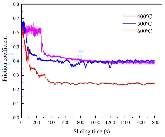 Figure 8 illustrates the COF of NiCoCrAlY-Cr2O3-AgMo coatings at high temperatures of 400 °C, 500 °C, and 600 °C. At 400 °C, the COF initially stabilizes around 0.625, exhibiting minor fluctuations in the first 300 s. Then, the COF demonstrates a rapid decline to 0.5, followed by a gradual reduction, finally reaching 0.4 after 1800 s of operation. When the temperature is increased to 500 °C, the initial COF is observed to be 0.75. This is followed by a swift decrease to 0.4 in the first 200 s. The COF remains relatively stable for the following 400 s. However, after 600 s, the average COF rises to 0.425, accompanied by more significant fluctuations. At a temperature of 600 °C, the initial COF is 0.625. The COF then experiences significant fluctuations, eventually stabilizing after 400 s with an average value of 0.26. As evident from these results, the COF exhibits a decreasing trend with increasing temperature, accompanied by enhanced stability. This phenomenon can be attributed to the formation of a self-lubricating transfer film at high temperatures. The hardness of this film decreases as the temperature rises, leading to a reduction in the COF.