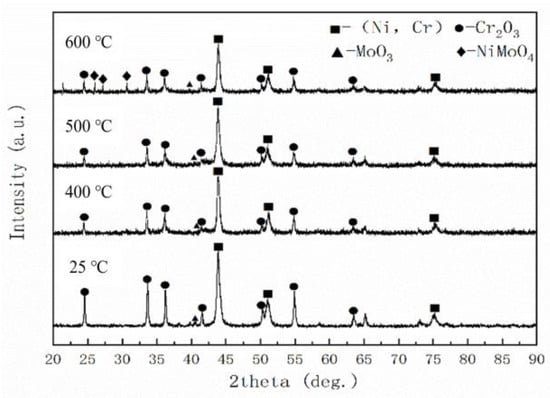 Figure 10 demonstrates the XRD results of the NiCoCrAlY-Cr2O3-AgMo coating’s friction surface at various temperatures. The XRD patterns at 400 °C and 500 °C are identical to those observed at room temperature. However, a new substance, NiMoO4, appears at 600 °C. The formation of NiMoO4 at this temperature plays a crucial role in reducing friction. It acts as a lubricant, effectively reducing wear and tear on the friction surface [25,26], whereas at lower temperatures (400 °C and 500 °C), the absence of such a lubricating substance leads to more significant wear due to adhesive wear mechanisms, particularly compared to room temperature and 600 °C [27].