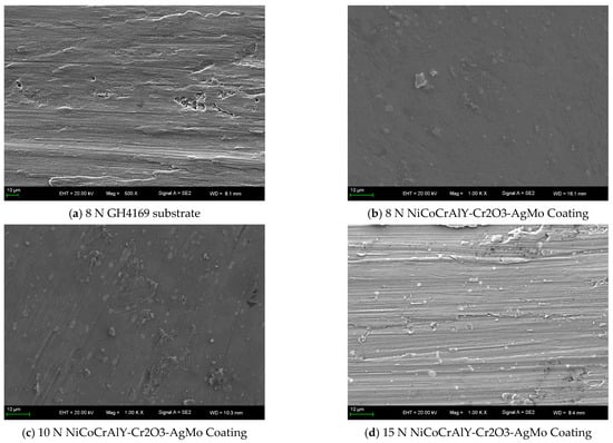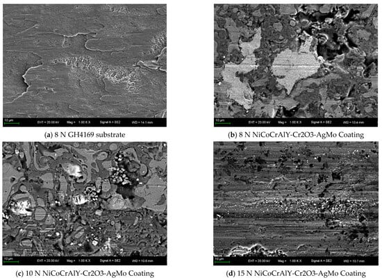 Figure 12a,b present the SEM images of the wear surface morphology of the GH4169 substrate and the NiCoCrAlY-Cr2O3-AgMo coating under an 8 N load. The GH4169 substrate exhibits significant grooving, a characteristic feature of abrasive wear. In addition, evidence of adhesive wear is apparent, indicated by material detachment and plastic deformation (Figure 12a). Under the same load, the NiCoCrAlY-Cr2O3-AgMo coating demonstrates a reduced extent of wear. Figure 12b indicates fewer wear scars compared to the GH4169 substrate, with the majority of the friction surface resembling the unworn surface. This observation highlights the coating’s remarkable ability to minimize wear, primarily through mild abrasion. Figure 12c illustrates the wear morphology of the NiCoCrAlY-Cr2O3-AgMo coating under a 10 N load. The wear tracks in the worn region are shallow, and a significant portion of the friction surface remains similar to the unworn state. Specifically, the coating surface remains intact, devoid of any detachment or cracks. However, upon increasing the load to 15 N, an increase in abrasive wear grooves and the appearance of fine wear debris become evident, signifying an increase in abrasive wear with increasing load. This phenomenon can be attributed to the increased stress and temperature at the coating surface resulting from the higher load. These factors influence the internal stress distribution, thermal stability, and thermal expansion behavior of the coating. At a 15 N load, the microstructure of the coating is severely damaged or even fails. Therefore, abrasive and adhesive wear mechanisms are exacerbated during the friction process.