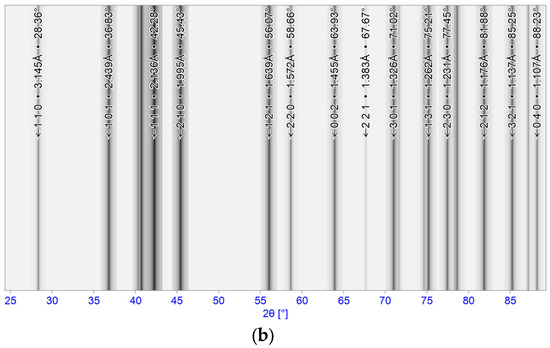 Modeling of three-dimensional structures and diffraction patterns of crystals was carried out using a VESTA 3D structure visualizer [29], according to the international database of materials, λ = 0.154 nm. The spatial structure of an ideal crystal was modeled. Based on the Wulff–Bragg condition, the X-ray diffraction of model structures were calculated. X-ray diffractions and interplanar distances of the obtained coatings were compared with the spectra obtained by modeling methods and deviations were identified. In addition, based on the obtained coating spectra, the reverse operation was performed to identify structures from the spectra.
