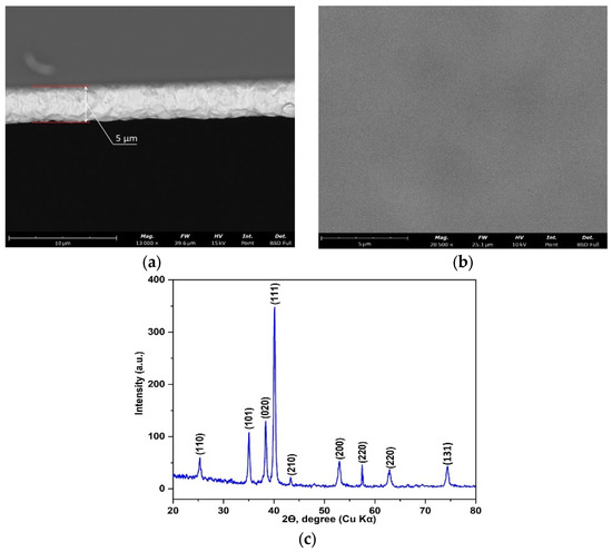 An X-ray phase analysis was carried out on Shimadzu XRD 6000 (Shimadzu Corp., Kyoto, Japan) with a Cu anode Kα (λ = 0.154 nm) using the sliding beam method (shooting angle 15°) in the 2θ range of 20–80°. Due to the low intensity of the peaks, the original signal was approximated by Gaussian curves. Before each analysis, the sample was fixed with glue on an amorphous polycarbonate cuvette. Thin-film samples were analyzed using symmetrical (Bragg–Brentano) geometry, in the 15–70° angle range, and asymmetrical geometry in the 20–50° range (in some cases, 15–70° angle range). The analysis of the interplanar distance (d) and Miller indices (hkl) of the samples was carried out using HighScore Plus software 4.0.