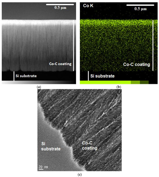 Figure 3a shows the interface between the Co-C coating and the silicon substrate. The coating structure has a granular structure, which may indicate a nanostructured nature of the film. Above the coating, the substrate is more uniform and less granular, which is typical for the structure of single-crystal silicon. The observed interface between the substrate is slightly blurred, indicating good adhesion of the coating to the substrate. Satisfactory adhesion is important for further applicability of the coatings for the mechanical stability and durability of the coating. The thickness of the synthesized Co-C coating was on average 5.0 ± 0.2 μm. Figure 3b shows the surface structure of the coating itself, which looks very dense, fine-grained, and uniform, indicating its highly dispersed structure. The grain size in the structure is almost indistinguishable, indicating the homogeneity of the growth and deposition process of the material during its formation. Figure 3c shows the X-ray diffraction pattern of this sample. The X-ray structural analysis established the main phases and parameters of the interplanar distance d (nm). The resulting Co-C film structure demonstrates identical hkl planes, but with changed d (nm), which indicates the formation of this structure, but with a slightly deformed crystal lattice. However, the resulting structure demonstrates magneto-optical properties, which indicates that the changes in the lattice are in the range of acceptable values. The results of the TEM study of the cross-section of the coating and the corresponding energy-dispersive spectrum are shown in Figure 4.