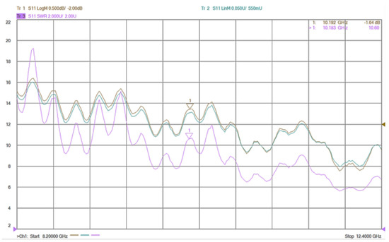 In the upper right corner of each graph there are numerical values for three markers: 1—numerical value at the midpoint of the frequency range of 8.2–12.4 GHz; 2—maximum of the measured value; 3—minimum of the measured value. The S11/S22 LogMag shows a general decrease in the signal strength over the frequency range. The S11/S22 SWR shows a similar trend to the LogMag, with peaks at the resonant frequencies, indicating a higher standing wave ratio at these points. The S11/S22 LinMag shows a more gradual decrease in signal strength, with more pronounced peaks at the resonant frequencies. Figure 7 suggests that the Co-C film sample exhibits some resonance behavior in the frequency range of 8.2–12.4 GHz, and the specific resonant frequencies are around 10.192 GHz and 10.183 GHz. The sample’s response in the given frequency range is likely related to the properties of the Co-C film itself.