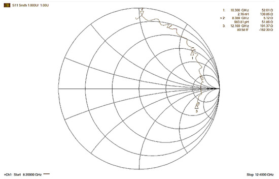 In Figure 7, the scale of the charts is nonlinear. The grid lines correspond to the points of constant active and constant reactance resistances. Points with the same active resistance are located along circles. Points with the same reactance form a set of arcs of different curvature. All resistance values are normalized relative to the wave impedance of the system of 50 Ohm (Z0). In the chart, the grid lines are arranged in such a way that the region of positive active resistances is displayed as a unit circle. The central horizontal axis corresponds to zero reactance. The center of the diagram represents Z/Z0 = 1, which corresponds to the wave impedance of the system. At the left and right intersection points of the horizontal axis with the outer circle, the impedance is zero and infinity, respectively. The outer circle corresponds to zero active resistance. The top and bottom halves of the diagram correspond to a positive and negative reactance, respectively. The value of the impedance modulus for the sample at a frequency of 8.3 GHz is 5.12 Ohm, while at a frequency of 10.3, it increases to 52.0 Ohm, and at 12.1 GHz to 191.37 Ohm.