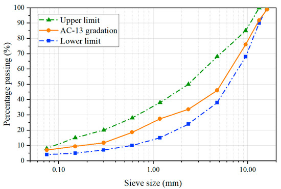 The type of asphalt mixture is AC-13 (asphalt concrete with a nominal maximum aggregate size of 13.2 mm), with both coarse and fine aggregates composed of basalt, and mineral filler consisting of limestone powder. According to ASTM D2172 [35], the asphalt content is 4.9%. The final composite gradation is shown in Figure 1, with the upper and lower limits based on the Chinese standard JTG F40-2004 [36]. The basic volumetric parameters and properties of the asphalt mixture are presented in Table 2.