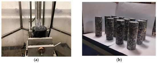 Preparation of small-size AC-13 specimens: (a) Coring of larger specimens; (b) specimens with a radius of 38 mm and a height of 100 mm were obtained.