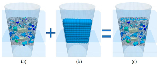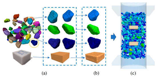 Based on the above conclusions, in this study, a value of 0.8 was chosen for the DRF and used balls with a particle size of 1.6 mm (2.0 mm × 0.8). As shown in Figure 4a, the volume percentage corresponding to the asphalt mortar was obtained through calculation, and combined with the DRF, and the mortar particles were randomly placed within the mold of the specimen. Subsequently, as shown in Figure 4b, after adding mortar particles to a model where coarse aggregate particles and smart aggregates have been placed, there will be a large amount of overlap between the particles and equilibration will need to continue. After equilibrium is reached, the velocity and angular velocity of the smart aggregate are unlocked, and then subsequent simulation tests are carried out.