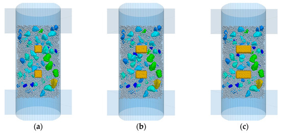 DEM models of asphalt mixtures with smart aggregates of different sizes: (a) Specimens with smart aggregates of 10 mm × 10 mm × 10 mm; (b) specimens with smart aggregates of 15 mm × 15 mm × 10 mm; (c) specimens with smart aggregates of 20 mm × 20 mm × 10 mm.