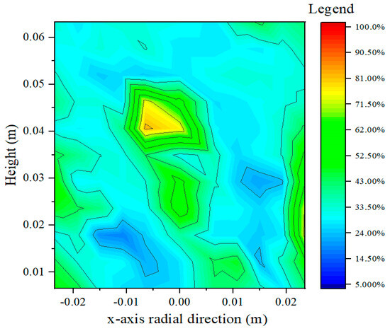 Figure 8 shows the void distribution contour map of the longitudinal section of an asphalt mixture DEM model without smart aggregates, obtained using the aforementioned method. The average void ratio in the longitudinal section contour map of this specimen is 39.96%, with a maximum value of 79.35%, a minimum value of 15.72%, and a standard deviation of 15.72.