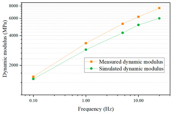 The simulated dynamic modulus values of the asphalt mixture specimen model at 25 °C, along with the experimentally measured dynamic modulus values, are presented in Figure 9. The simulated dynamic modulus at frequencies of 0.1, 1.0, 5.0, 10.0, and 25.0 Hz corresponds to 94.93, 90.23, 88.07, 89.63, and 85.74% of the measured values, respectively. In the discrete element model, the simulated dynamic modulus is 5.07% to 14.26% lower than the experimental values. This discrepancy may be attributed to the following reasons: (1) The surfaces of the “Ball” and “Clump” elements used in the model are smooth, which does not effectively account for the roughness of aggregate surfaces and the interlocking effect between particles; (2) In the densely packed “Ball” particles, there are unfilled voids. During the loading process, the number of particles actually in contact with the upper wall and the total contact area differ from the cylindrical cross-sectional area of the specimen. Despite these factors, the results validate that the discrete element model exhibits good accuracy and provides useful trends for testing the dynamic modulus of asphalt mixtures.