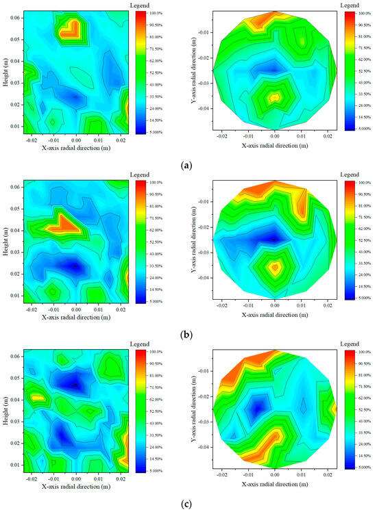 Void distribution contour maps of asphalt mixtures embedded with smart aggregates of different sizes: (a) Void distribution contour map for smart aggregates of 10 mm × 10 mm × 10 mm; (b) void distribution contour map for smart aggregates of 15 mm × 15 mm × 10 mm; (c) void distribution contour map for smart aggregates of 20 mm × 20 mm × 10 mm.