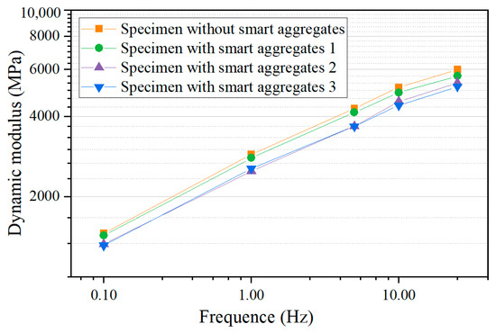Dynamic modulus at 25 °C for asphalt mixture specimens with and without embedded smart aggregates.