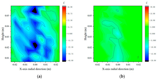 In laboratory testing, it was observed that to ensure the survival of smart aggregates, they are generally added to the asphalt mixture after the high-temperature mixing process (which can reach up to 170–190 °C), rather than participating in it. This practice results in a lack of asphalt coating on the surface of the smart aggregates, leading to differences in adhesion with the surrounding mixture. Particularly, when the size of the smart aggregates is relatively large, the asphalt mixture with embedded smart aggregates sometimes develops minor cracks during the cooling process. To investigate the reasons for the reduction in dynamic modulus caused by smart aggregates, in this study, a method was employed similar to that in Section 2.3 to establish the internal strain rate distribution contour maps for asphalt mixture specimens both with and without embedded smart aggregates of three different sizes. These maps were obtained for specimens under balanced and offset half-sine load conditions to further investigate the impact of smart aggregates on the internal strain of the mixture under loading conditions.