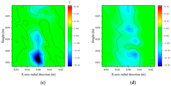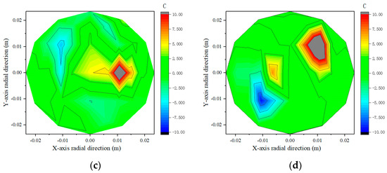 The z-axis longitudinal strain contour maps indicate that smart aggregates influence the internal stress and strain transfer process from top to bottom within the specimens, acting as a form of resistance during dynamic axial loading. This effect increases with the size of the smart aggregates. However, after embedding smart aggregates, the dynamic modulus of the asphalt mixture specimens actually decreases, suggesting an overall increase in specimen strain. Therefore, in this study, the strain conditions of the specimen transverse sections were further analyzed at peak load state. The transverse strain rate contour maps are shown in Figure 13. The strain rate values on the transverse section are 0.24776/s, 0.28194/s, 1.37704/s, and 2.53669/s, with standard deviations of 0.64185, 2.12624, 3.90826, and 5.11273, respectively. This indicates that smart aggregates increase deformation in the transverse section of the specimens, and this effect becomes more pronounced with larger aggregate sizes. Considering both the z-axis longitudinal and transverse strain rate contour maps, the results suggest that under half-sine dynamic loading conditions in the axial downward direction, smart aggregates partially prevent downward deformation of the internal structure of the mixture. However, in the transverse radial direction, they induce significant deformation, leading to a reduction in the overall modulus of the specimens.