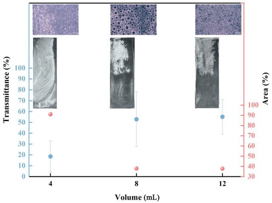 - Transmittance Testing: The transmittance of the films was measured using a UV-VIS spectrophotometer. Samples were cut into 0.5 × 0.5 cm pieces and numbered, and then random sampling was conducted for testing the transmittance at 580 nm, with a scanning rate of 100 nm/min. The measurements were taken five times, and the average value was recorded.