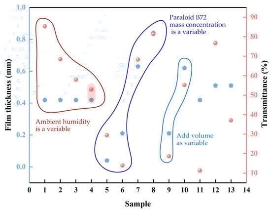 - Sample Preparation: Prior to the formal experiment, our research group conducted a series of preliminary experiments and reached the conclusion that the whitening of Paraloid B72 was related to the environmental humidity during the curing process. Based on this conclusion, we took the participating factors in the curing process as variables to study whether the participating factors would affect the degree of whitening. According to the pre-experiment results, the factors in the curing process of Paraloid B72 were designed as experimental variables to explore the whitening mechanism of Paraloid B72, as shown in Table 1. A certain amount of Paraloid B72 solution was placed in a silicone paper box with a bottom area of 7.6 × 2.5 cm2 and cured in a constant temperature and humidity chamber at different ambient humidities, with the temperature set at 25 °C. In order to increase the rationality of the experiment, three parallel samples were set for each group of samples, and the properties of the films were subsequently measured after curing. In order to guarantee the stipulated humidity conditions and to minimize the impact of the chamber’s air circulation system on the curing of Paraloid B72 films, an open acrylic box was positioned within the chamber, with the opening positioned away from the strongest airflow. The samples were then subjected to curing within the aforementioned acrylic box.