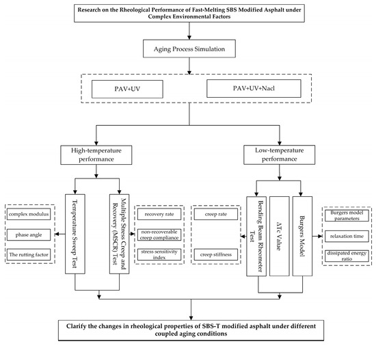 Over the long-term use of asphalt pavements, various types of distresses such as cracking, pumping, raveling, and delamination occur on road surfaces due to the influence of temperature, sunlight, water, and vehicle loads, ultimately affecting the service life of the asphalt pavement. Modifying asphalt is one of the key methods to enhance asphalt performance and improve the service quality of asphalt pavements, with SBS block copolymers being effective in improving both the low-temperature and high-temperature performance of asphalt, and their mechanical properties in complex environments directly affect the mechanical properties of asphalt concrete and road performance [1]. As a material with excellent high- and low-temperature properties, SBS-modified asphalt, prepared using dry-process modification techniques, has been widely used in pavement construction and maintenance, differing from traditional wet-process modification techniques. The dry process eliminates the processing steps in the modified asphalt plant by separating the use of the modifier and the base asphalt, with the SBS modifier being directly added to the mixing drum. This process consumes significantly less energy than the wet process used to produce the same amount of modified asphalt. Some researchers have explored the road performance of dry-process direct-addition SBS modifiers and analyzed various test results, showing that the technical requirements of direct-addition SBS-modified asphalt meet the standard specifications, with certain performance indicators even outperforming those of the wet-process method [2]. However, the study did not further take into account the impact of aging factors. Asphalt aging is a progress; an essential characteristic of asphalt pavements is their resistance to cracking induced by thermal shrinkage during temperature reductions or by the repeated action of traffic loads, typically exacerbated by ageing. Decreasing air and pavement temperatures lead to the development of tensile stresses within the asphalt mixture. Owing to bitumen’s intrinsic viscoelastic properties, it possesses the ability to relax and thereby reduce these tensile stresses over time. The tive process and its rate of development significantly impacts the service life of pavements. The essence of asphalt aging lies in the chemical structural changes of various compounds within the asphalt, which result in an increased solubility parameter difference between asphaltenes and maltenes. This leads to reduced compatibility between these components, ultimately manifesting as a decline in the performance of asphalt in road applications [3]. The addition of an SBS modifier significantly enhances the high- and low-temperature performance of asphalt and is, therefore, widely applied in engineering practice. However, after aging, the unsaturated double bonds in the SBS modifier can easily degrade, leading to a significant reduction in performance [4]. In addition, SBS-T-modified asphalt exhibits different performance characteristics depending on the temperature and loading duration. Under high temperatures and slow-moving loads, it behaves as a purely viscous material, making it prone to plastic deformation and rutting. At low temperatures and high loading rates, it behaves elastically but eventually becomes brittle, leading to low-temperature cracking [5]. The issues of high-temperature rutting and low-temperature cracking in asphalt pavements are primarily related to the rheological properties of asphalt. These characteristics must be evaluated and described using appropriate technical indicators [6,7]. Some researchers have studied the low-temperature performance of different types of asphalt using the Bending Beam Rheometer (BBR) test and fitted the BBR creep stiffness curves and master stiffness curves with the Burgers model equation. The results demonstrated that the Burgers model equation can effectively fit both the BBR creep stiffness curves and the master stiffness curves [8]. Therefore, this study also utilizes the Burgers model to conduct a more in-depth investigation into the low-temperature performance of modified asphalt. In conclusion, researchers from various countries have proposed different optimization indicators based on the rheological and mechanical properties of asphalt, resulting in varying evaluation outcomes and differing applicability. These indicators still have certain limitations and inapplicability in evaluating the high- and low-temperature performance of asphalt [9]. Most researchers use a dynamic shear rheometer (DSR) and bending beam rheometer (BBR) to study the rheological properties of modified asphalt. However, the research on the high- and low-temperature rheological performance of SBS-T-modified asphalt under different coupled aging conditions is still not thorough enough. Therefore, it is necessary to investigate the impact of coupled aging on the rheological properties of dry-process SBS-modified asphalt.