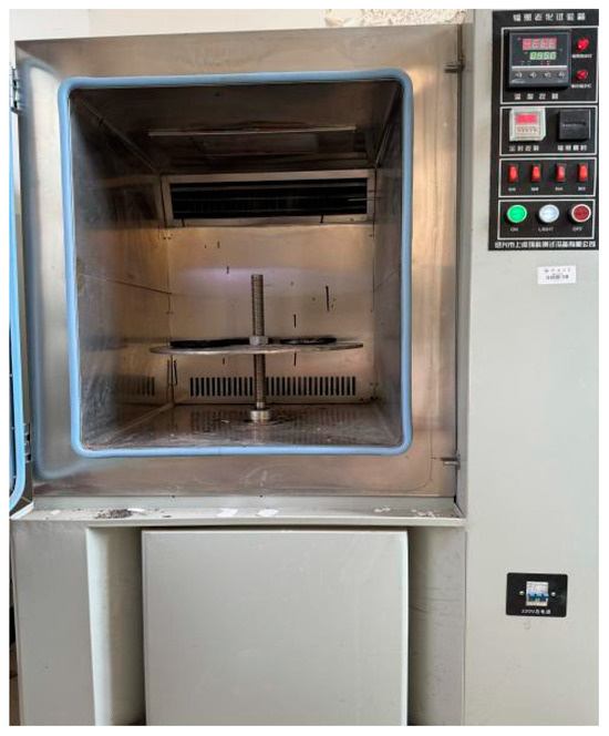 Before studying the coupled aging of asphalt, the short-term aging of the asphalt during mixing, transportation, and paving was first simulated using the rolling thin-film oven test (RTFOT). After short-term aging, the SBS-T-modified asphalt samples were placed in a pressure aging vessel (PAV) to simulate long-term aging. Subsequently, the long-term aged samples were subjected to ultraviolet aging in a UV aging test chamber, simulating the combined effects of thermo-oxidative and UV aging. As shown in Figure 3, the UV aging test chamber is equipped with a high-pressure mercury lamp, rated at 1 kW, with a UV wavelength of 350 nm. The sample was placed 50 cm away from the light source, and the UV radiation intensity, measured using a UV photometer, was 150 w/m2. The internal temperature of the UV aging chamber was set to 45 °C. Most scholars, both domestically and internationally, use an aging period of less than 15 days for UV aging [26,27,28]. Based on the relevant literature, this study selected a UV exposure time of 7 days. Additionally, to introduce the effects of a salt environment, a predetermined amount of prepared salt solution was sprayed onto the asphalt surface daily during UV aging.