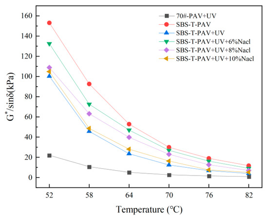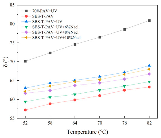 As the temperature increases, the complex modulus of all asphalt samples gradually decreases, while the phase angle increases. This indicates that as the asphalt softens with heating, its rheological behavior transitions from elastic to viscous. Under the same temperature and aging conditions, the complex modulus of SBS-T-modified asphalt is consistently higher than that of 70# base asphalt, while the phase angle is consistently lower, indicating that the dry-process SBS modifier improves the asphalt’s resistance to deformation. The complex modulus of SBS-T-modified asphalt after pressure and UV-coupled aging is higher than that after single-factor (PAV) aging, with the opposite trend observed for the phase angle, indicating that these two factors combined accelerate asphalt aging. As the temperature increases, the asphalt exhibits typical two-point plastic flow, making it more prone to high-temperature rutting. After the addition of the salt solution factor, the complex modulus increases, and the phase angle decreases under the combined effects of pressure, UV, and salt solution, indicating that for salt-eroded asphalt samples, the viscous components decrease, while the elastic components increase, thereby enhancing the elastic.
