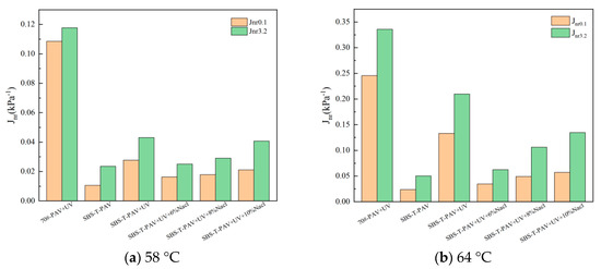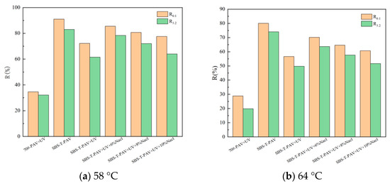 The MSCR parameters R and Jnr are critical indicators of the asphalt’s rutting resistance [33]. A lower Jnr and a higher R indicate stronger rutting resistance in the asphalt. The calculated Jnr and R values for different asphalt samples are shown in Figure 7 and Figure 8. From these figures, it is evident that as the temperature increases, the non-recoverable creep compliance (Jnr) of the six asphalt samples increases significantly, while the recovery rate (R) decreases. This indicates that higher temperatures lead to greater residual deformation and reduced rutting resistance in the asphalt. Under the same temperature and aging conditions, the R values of the SBS-T-modified asphalt are significantly higher than those of the 70# base asphalt, and the Jnr values are lower, indicating that the addition of the SBS-T modifier substantially increases the elastic component of the asphalt. As a result, the SBS-T-modified asphalt exhibits less permanent plastic deformation under external forces, allowing it to better withstand traffic loads.