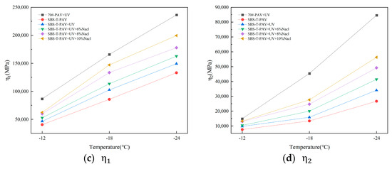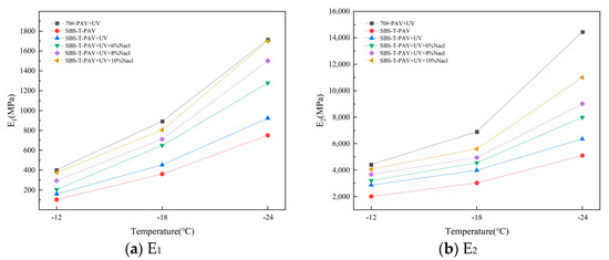 As shown in Figure 13, with decreasing temperature, all four parameters of the Burgers model—the instantaneous elastic modulus E1 of the Maxwell model, the delayed elastic modulus E2 of the Kelvin model, the instantaneous damping coefficient of the Maxwell model, and the delayed damping coefficient of the Kelvin model—increase, indicating that the stress relaxation capacity of the aged asphalt weakens at low temperatures. Furthermore, the increase in the four viscoelastic parameters for SBS-T-modified asphalt is less pronounced compared to base asphalt, indicating a better low-temperature performance after modification. From the perspective of the proportion of viscoelastic parameters, and are much larger than E1 and E2, with the former being one or two orders of magnitude higher than the latter. This indicates that, whether for base or modified asphalt, the parameters reflecting the viscous characteristics in the Burgers model, composed of the Maxwell and Kelvin models, are larger than those reflecting the elastic characteristics. Additionally, the more complex the aging factors and the higher the salt solution concentration, the larger the four parameters of the SBS-T asphalt.