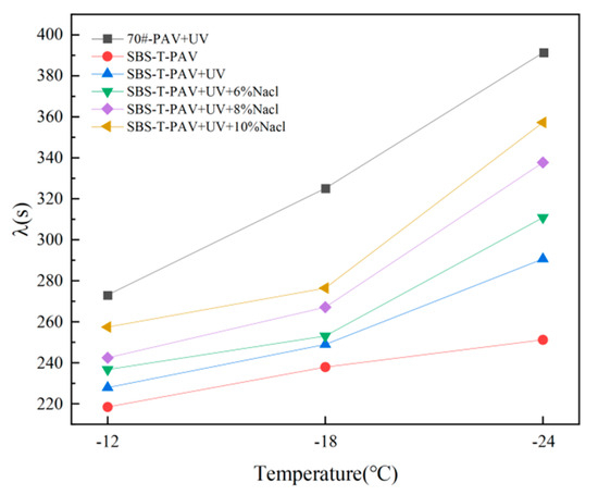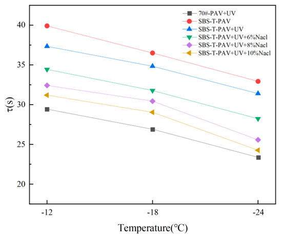 It can be seen from Figure 14 and Figure 15 that the relaxation time of the six asphalts gradually increase with a decrease in temperature, indicating that a reduction in temperature can increase the friction resistance of the movement of the asphalt molecular chain and reduce the ability of asphalt to quickly dissipate stress, so that the asphalt can be cracked and damaged at low temperatures. Compared with matrix asphalt, the relaxation time of modified asphalt after single-factor pressure aging is obviously shorter, because the modifier can significantly improve the viscoelasticity of the asphalt, reduce the energy consumption rate of asphalt, and make the asphalt not easy to crack at low temperatures. SBS-T-modified asphalt after pressure, ultraviolet, and salt solution coupling aging has a longer relaxation time than SBS-T-modified asphalt after pressure and ultraviolet coupling aging, and with the increase in the concentration of salt solution, the relaxation time becomes longer, indicating that the addition of salt damages the low-temperature cracking resistance of asphalt.