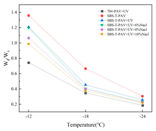 As seen in Figure 16, the dissipated energy ratio decreases as the temperature decreases, indicating that lower temperatures significantly reduce the dissipation of stored energy within the asphalt. Comparing the SBS-T-modified asphalt under different aging conditions, the asphalt aged by pressure alone shows the highest dissipated energy ratio and the best low-temperature crack resistance, followed by the asphalt aged by pressure and UV combined, and lastly, the asphalt aged by pressure, UV, and salt solution combined. This indicates that as UV and salt solution aging factors increase, the relaxation capacity of SBS-T-modified asphalt deteriorates. As the concentration of the salt solution increases, the dissipated energy ratio decreases, particularly at −18 °C and −24 °C. When the salt solution concentration reaches 10%, the dissipated energy ratio approaches that of the base asphalt, indicating that at lower temperatures, high concentrations of salt solution exacerbate the dissipation of stored energy in asphalt, leading to poorer low-temperature performance.