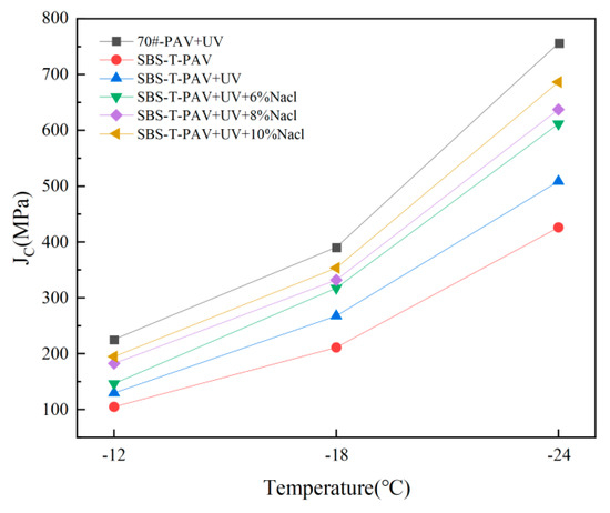 The smaller the JC value, the better the low-temperature performance of the asphalt. Figure 18 shows that the comprehensive low-temperature compliance parameter increases as the temperature decreases. After pressure aging, the JC value for SBS-T-modified asphalt is lower than that of the 70# base asphalt, indicating that the viscous component proportion in the SBS-T-modified asphalt is relatively large, and its viscous properties can help relax tensile stress, reducing the likelihood of low-temperature cracking. SBS-T-modified asphalt shows the smallest JC value after pressure aging alone. When aging conditions become more complex, such as when pressure and UV are combined, or when pressure, UV, and salt solution are combined, the JC value increases, indicating that UV and salt solution reduce the low-temperature crack resistance of asphalt.