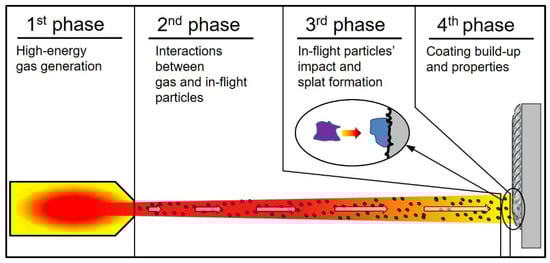 There are heat and mass transfer processes between highly energetic gases, the particles of coating materials and the substrate during the coating process. The final properties of the coating are determined by the oxide layer, adhesion, porosity, compound inclusions, hardness, and residual stresses [4]. Due to the complexity of the coating process, different authors divided the process into four main phases, as shown in Figure 1 [5,6].