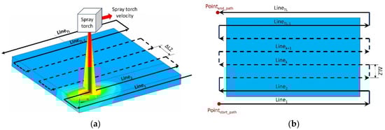 A path is defined as a motion sequence of the torch and/or substrate during the coating process to cover the entire surface. In this case, a robot is employed to move the torch. The torch follows each line or trajectory of the path with a line offset, ΔLZ, as shown in Figure 3. The ΔLZ is the distance between two consecutive parallel lines or trajectories. The total number of spray lines, TL, is the total length of the path.