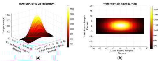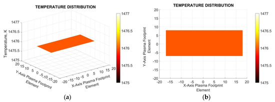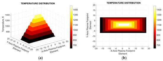 (a) The 3-D and (b) 2-D temperature distribution views of the plasma plume constant profile. Parameters: Thigh = 1476 K, BlockX = 36 elements, and BlockY = 16 elements.