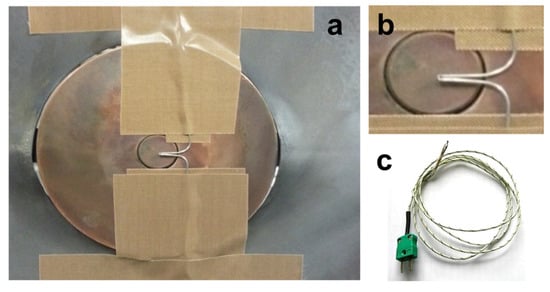 Measurement of the plasma plume temperature distribution: (a) thermocouple measurement setup; (b) detail of the thermocouple placed on the surface of water-cooled disk; and (c) the type K thermocouple employed.