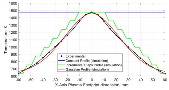 The thermocouple tip has been placed on the surface of the water-cooled disk, allowing the performance of stationary measurements of different positions radially in the plasma plume without the melting of the surface. Fibreglass insulation tape is used to fix and insulate the thermocouple, reducing the heat transfer between the sensor and the cooled disk, which would affect the measured temperature. The plasma torch parameters are defined in Table 2. It should be noted that the experimental measurements were carried out without the spraying of the coating material to avoid interferences in the temperature measurement due to the deposition of a coating. The experimental X-axis dimension flame profile was measured using the next procedure. First, the torch was moved to the measurement centre, which is defined as the thermocouple placement. After that, it was moved with a 5 mm X-axis incremental step to the measurement centre before waiting 10 s for thermocouple temperature stabilisation and acquiring the temperature directly from the thermocouple. This process was repeated every 5 mm X-axis incremental step until the total plasma footprint was covered in the X-axis. In this case, it ranged from −60 mm to +60 mm in the thermocouple placement. The measured experimental X-axis dimension plasma profile is shown by the black line in Figure 8. The experimental parameters of the flame profile were a maximum plasma temperature, THigh = 1476 K, minimum temperature on the border of the plasma area, TLow = 634 K, and a 60 mm radial dimension of the plasma area or footprint.